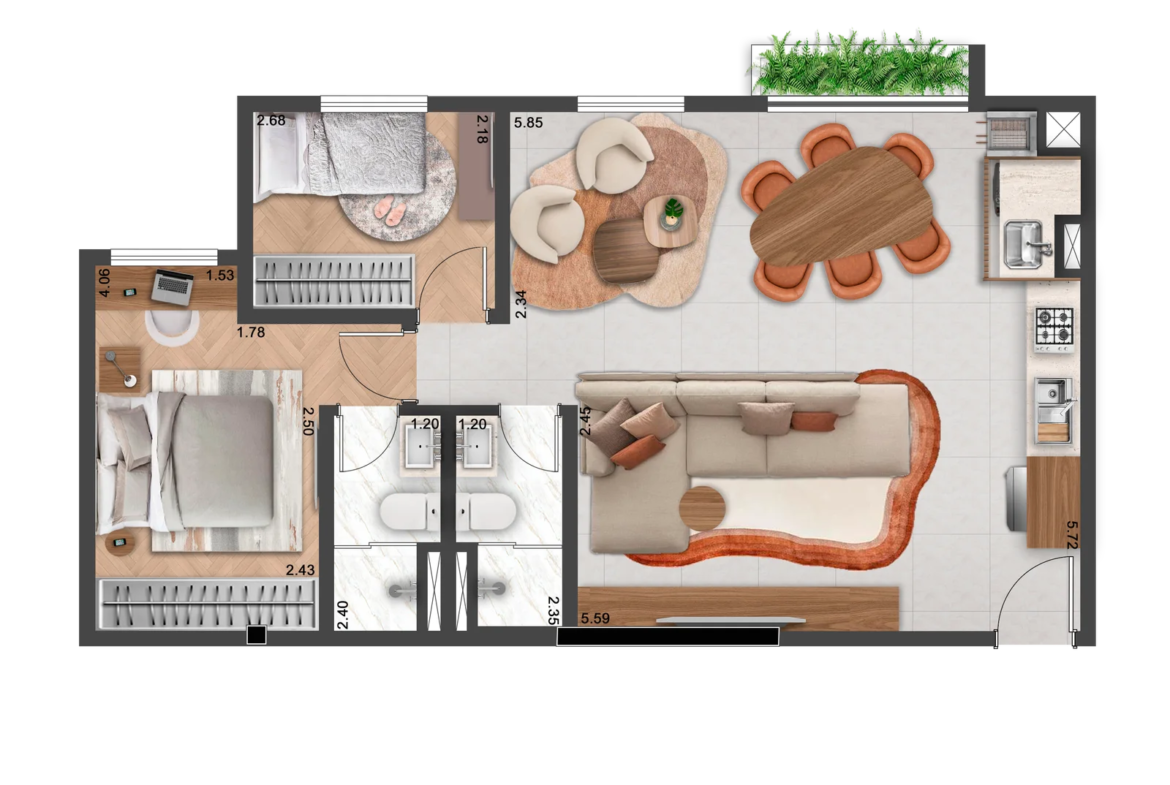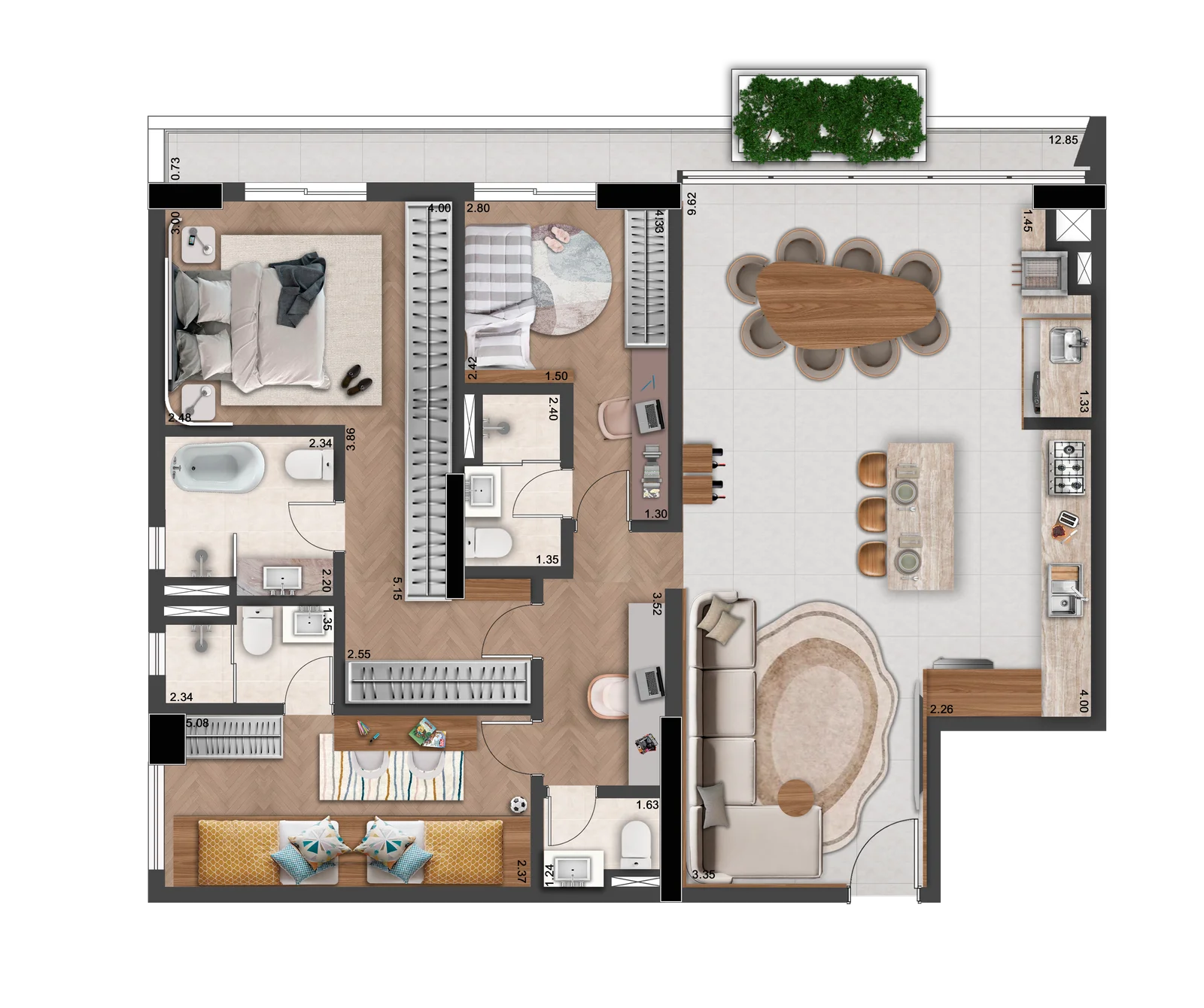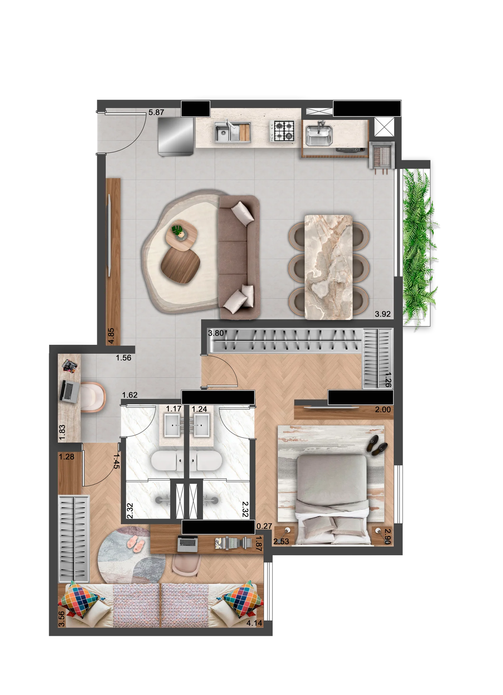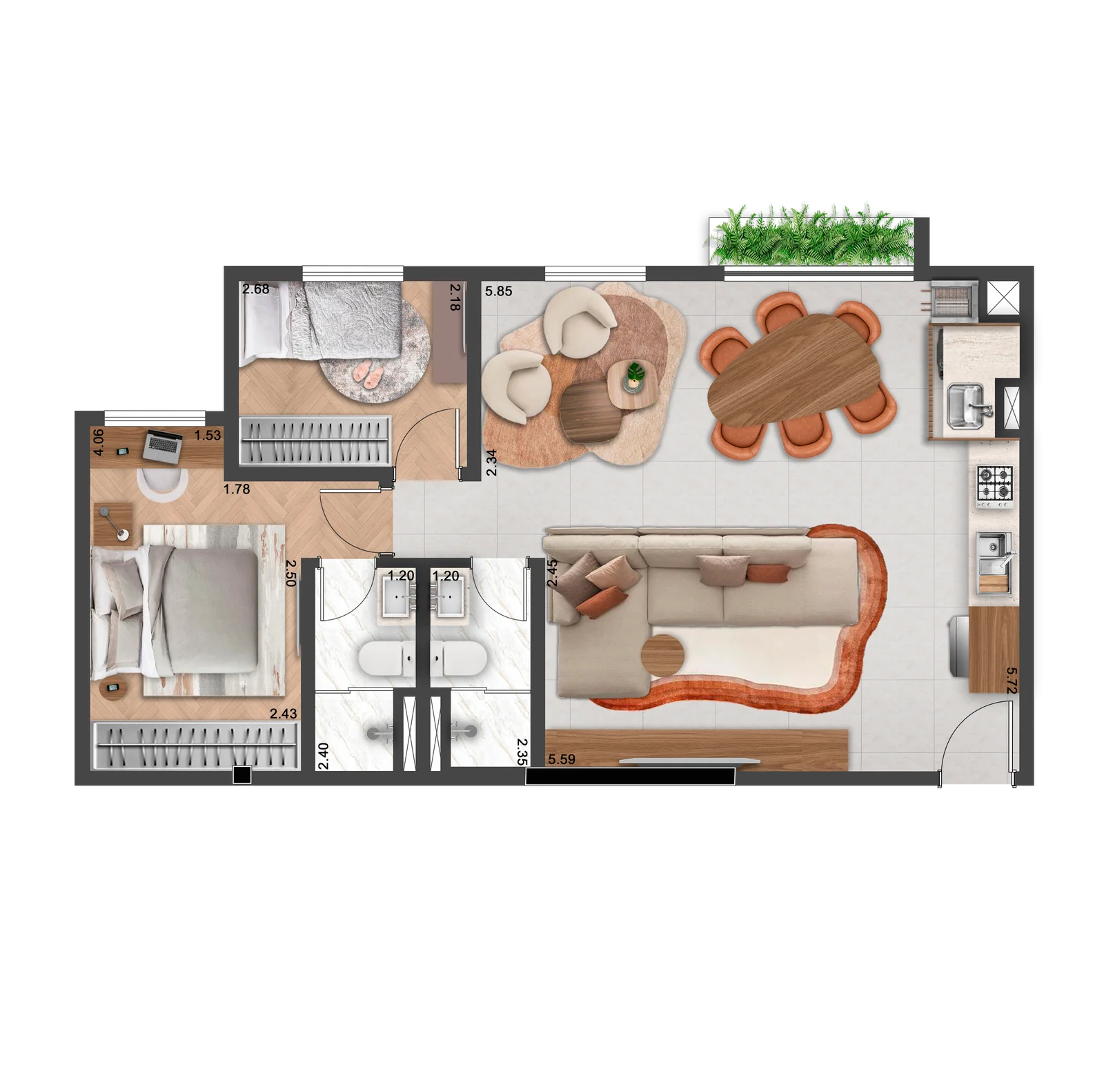 A separação entre áreas sociais e íntimas é clara, garantindo privacidade no uso diário. Unidades com maior metragem contam com living de pé-direito duplo, ampliando a entrada de luz e a percepção espacial. As variações de planta permitem adaptação conforme o perfil de uso, mantendo circulação funcional e ambientes bem definidos.