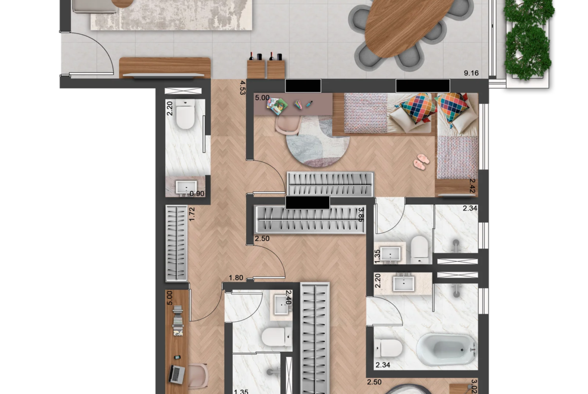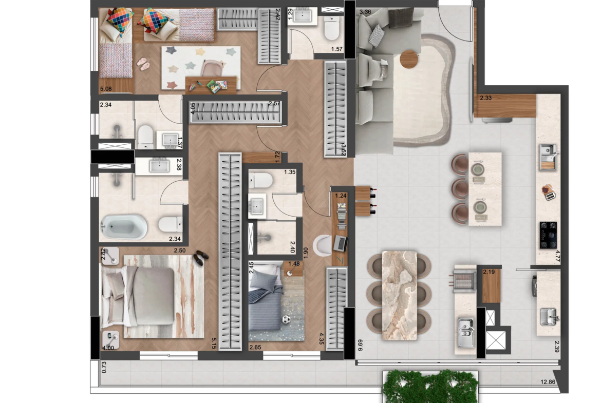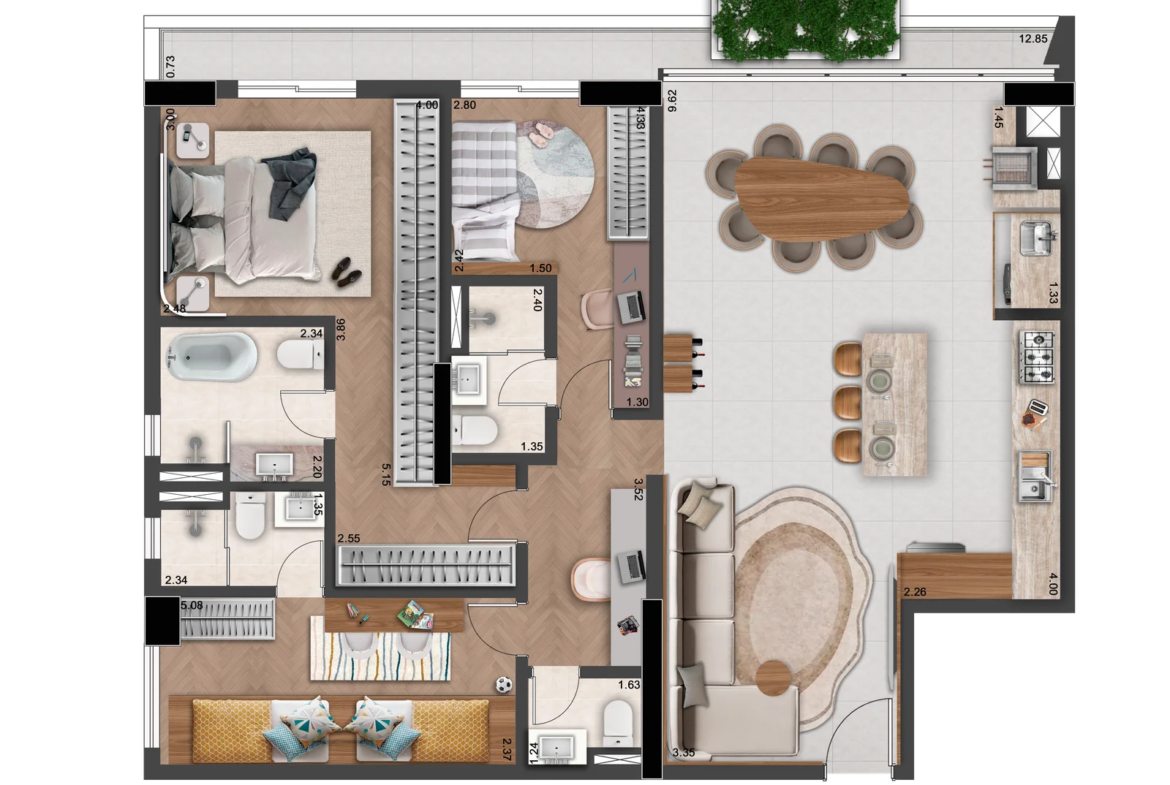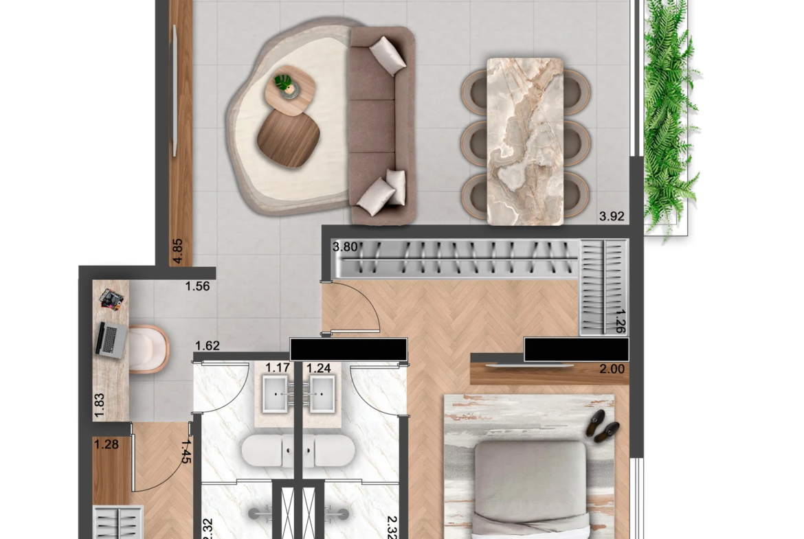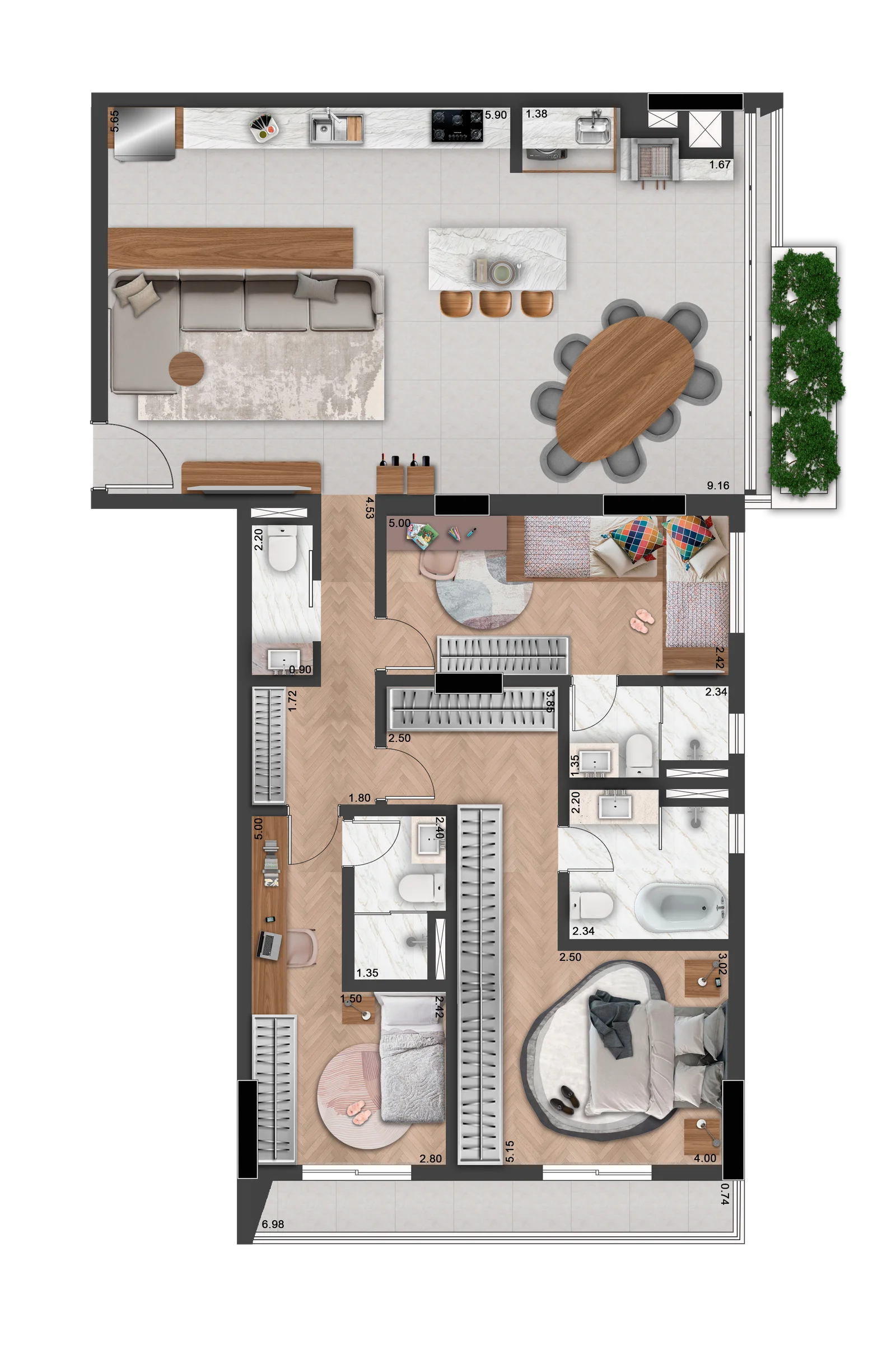 A separação entre áreas sociais e íntimas é clara, garantindo privacidade no uso diário. Unidades com maior metragem contam com living de pé-direito duplo, ampliando a entrada de luz e a percepção espacial. As variações de planta permitem adaptação conforme o perfil de uso, mantendo circulação funcional e ambientes bem definidos.