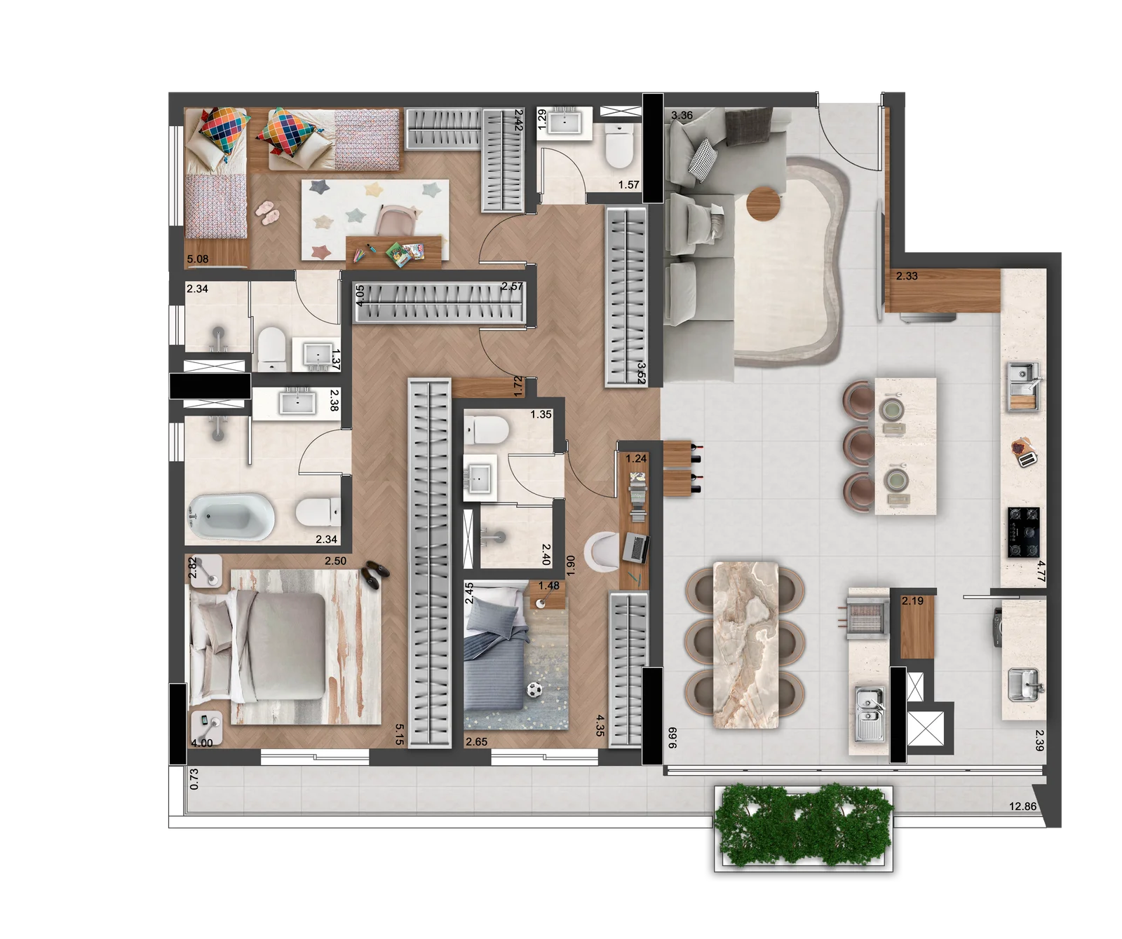 O empreendimento conta com living de pé-direito duplo em unidades selecionadas, varandas com floreiras irrigadas e pavimento dedicado ao bem-estar.