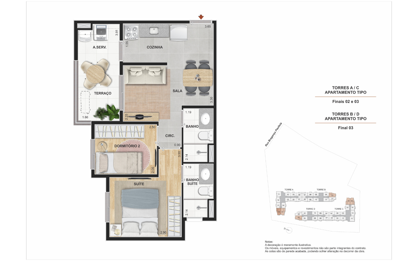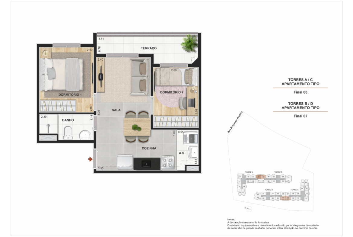 Unidades com 1 e 2 dormitórios, com layouts funcionais e opção de terraço.