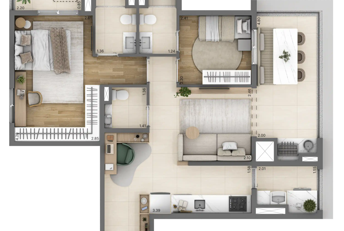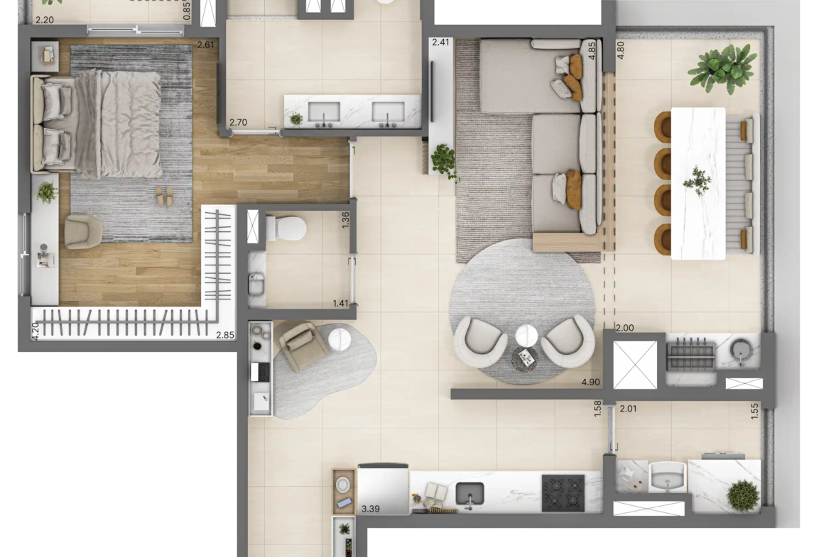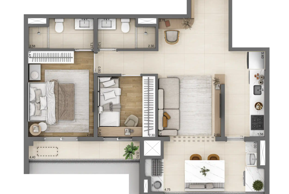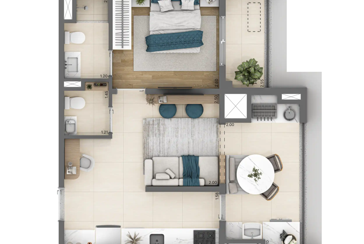 Os apartamentos do LINN Vila Mariana foram desenhados com foco em circulação funcional, boa iluminação natural e integração equilibrada entre os ambientes. As plantas variam de 45 m² a 79 m², com opções de 1, 2 ou 3 dormitórios.