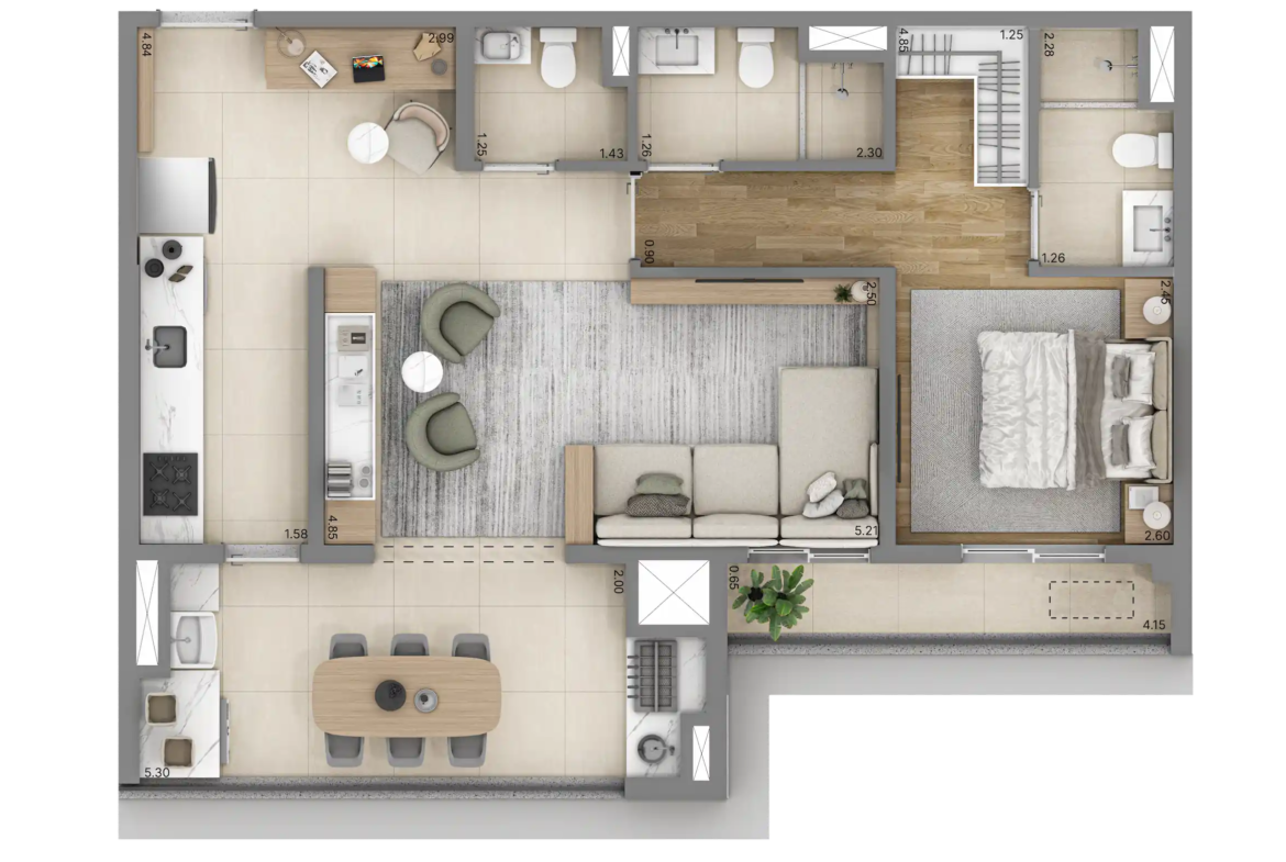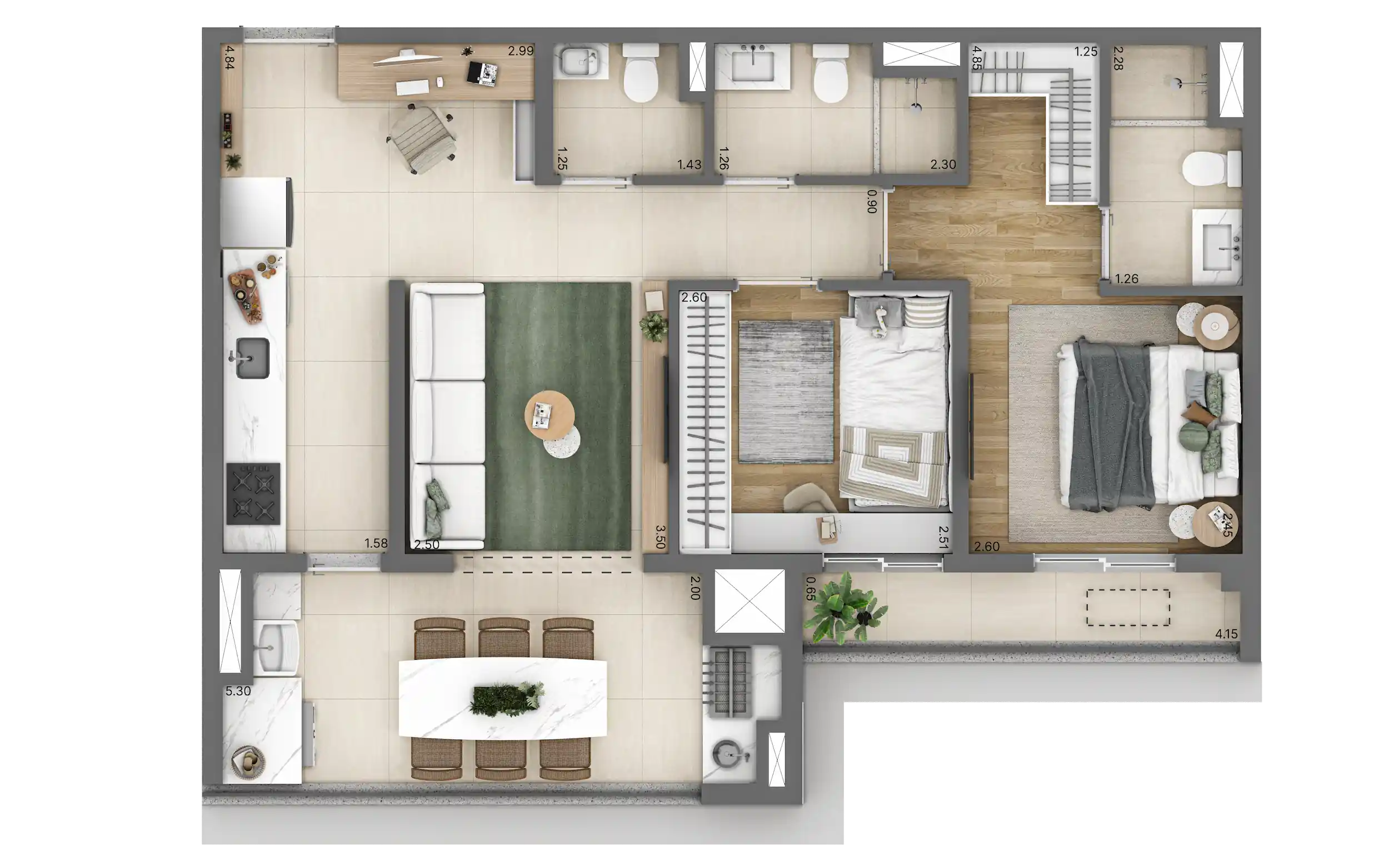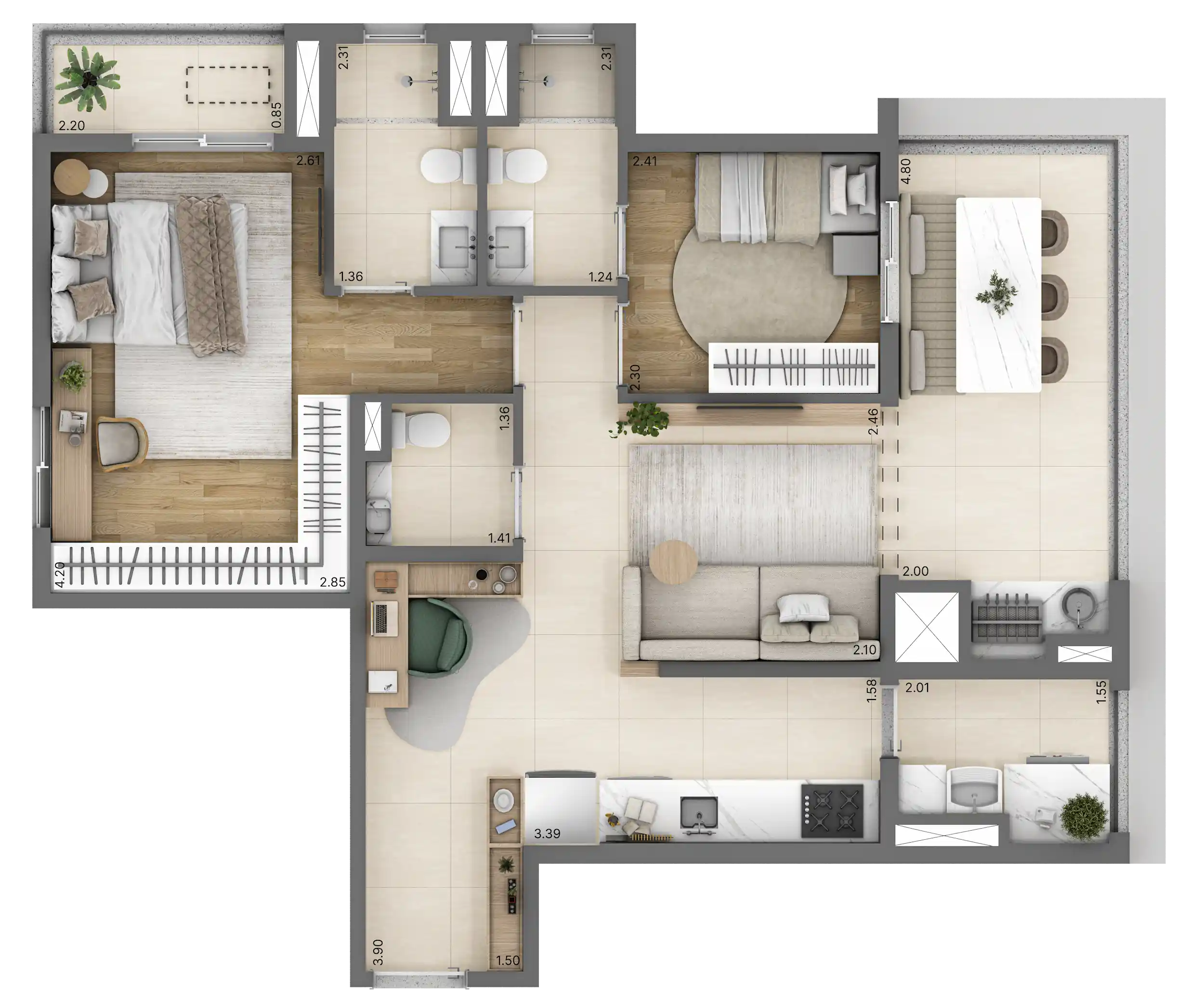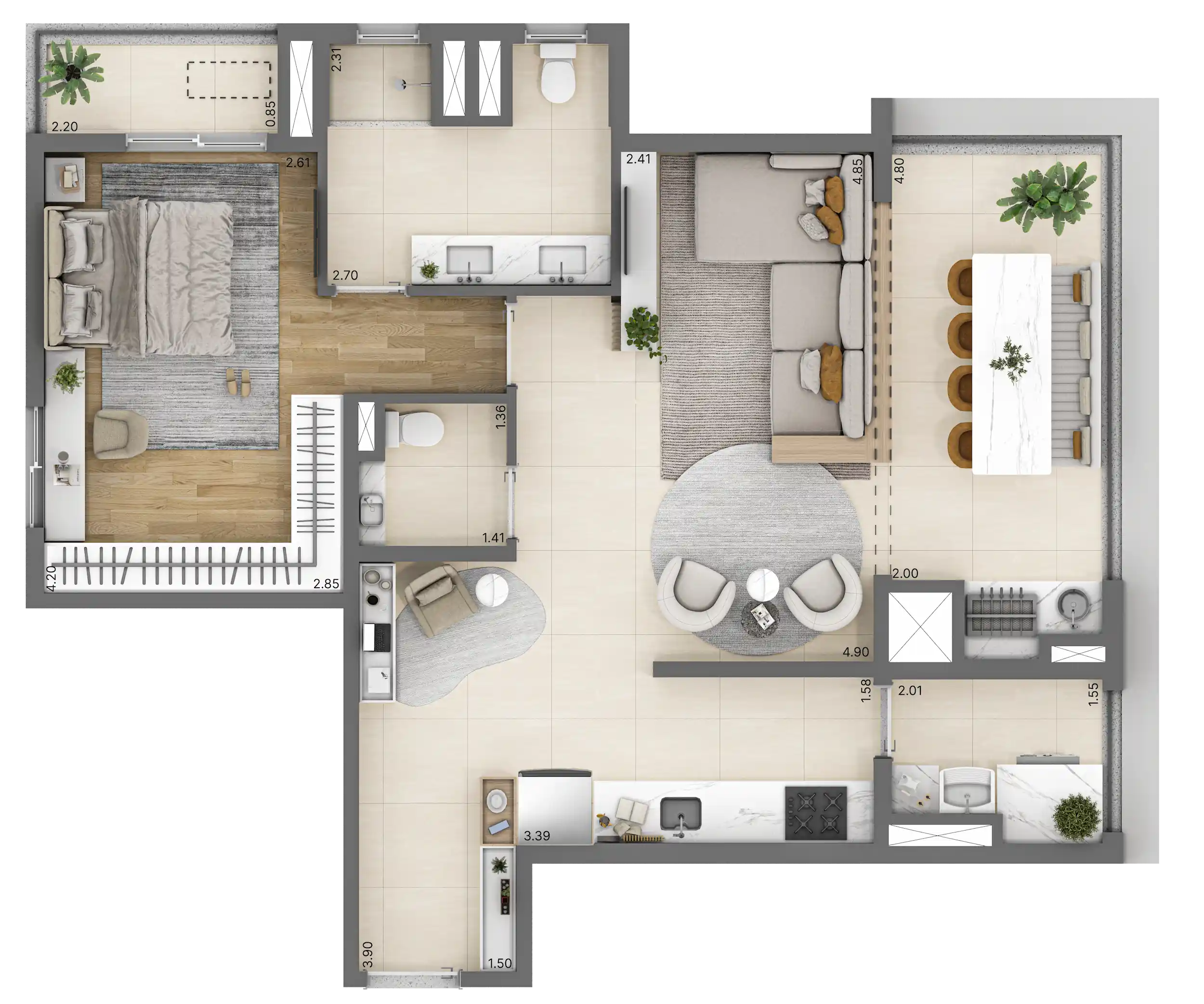 Os apartamentos do LINN Vila Mariana foram desenhados com foco em circulação funcional, boa iluminação natural e integração equilibrada entre os ambientes. As plantas variam de 45 m² a 79 m², com opções de 1, 2 ou 3 dormitórios.