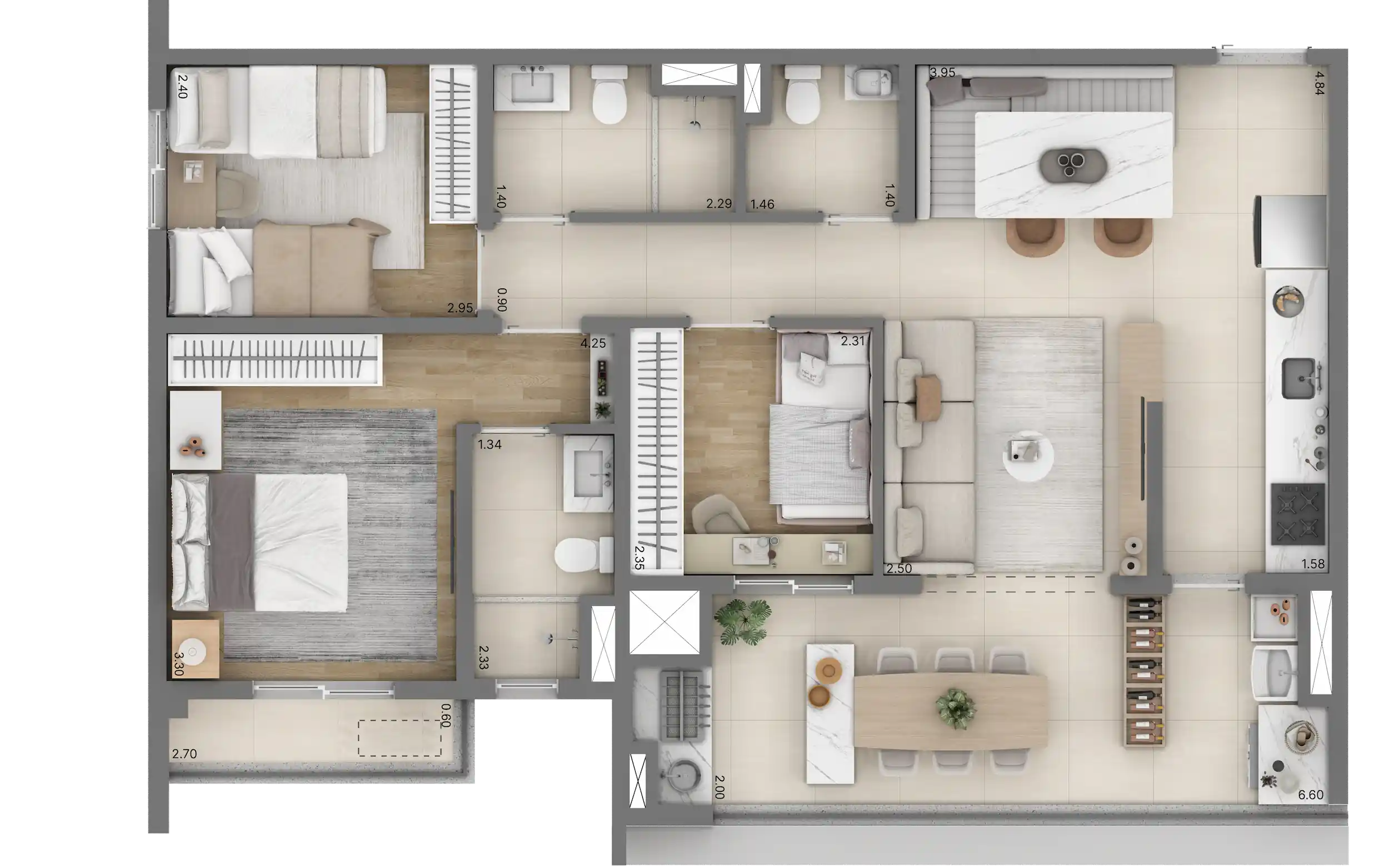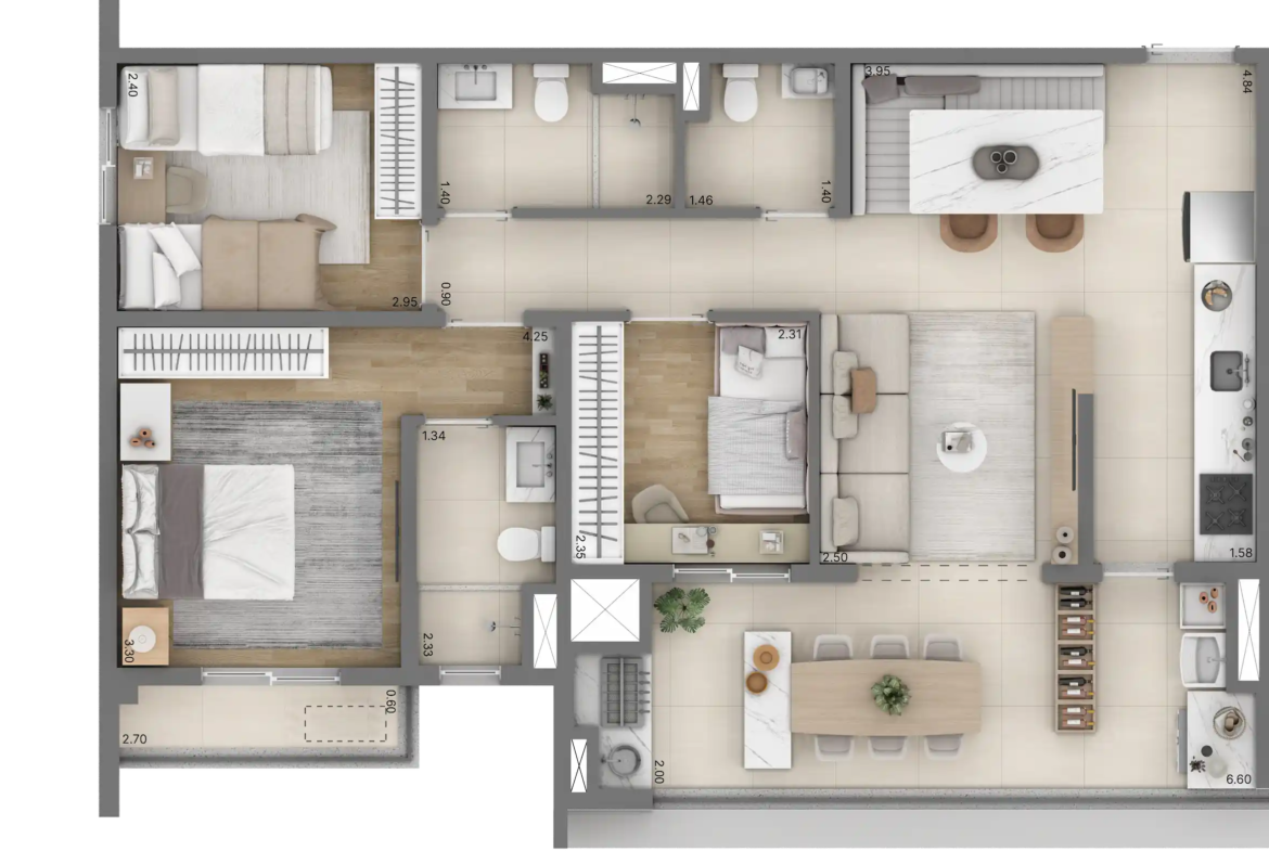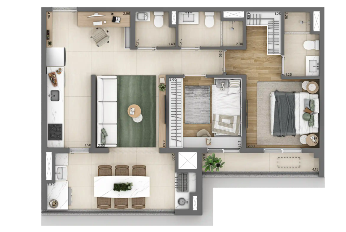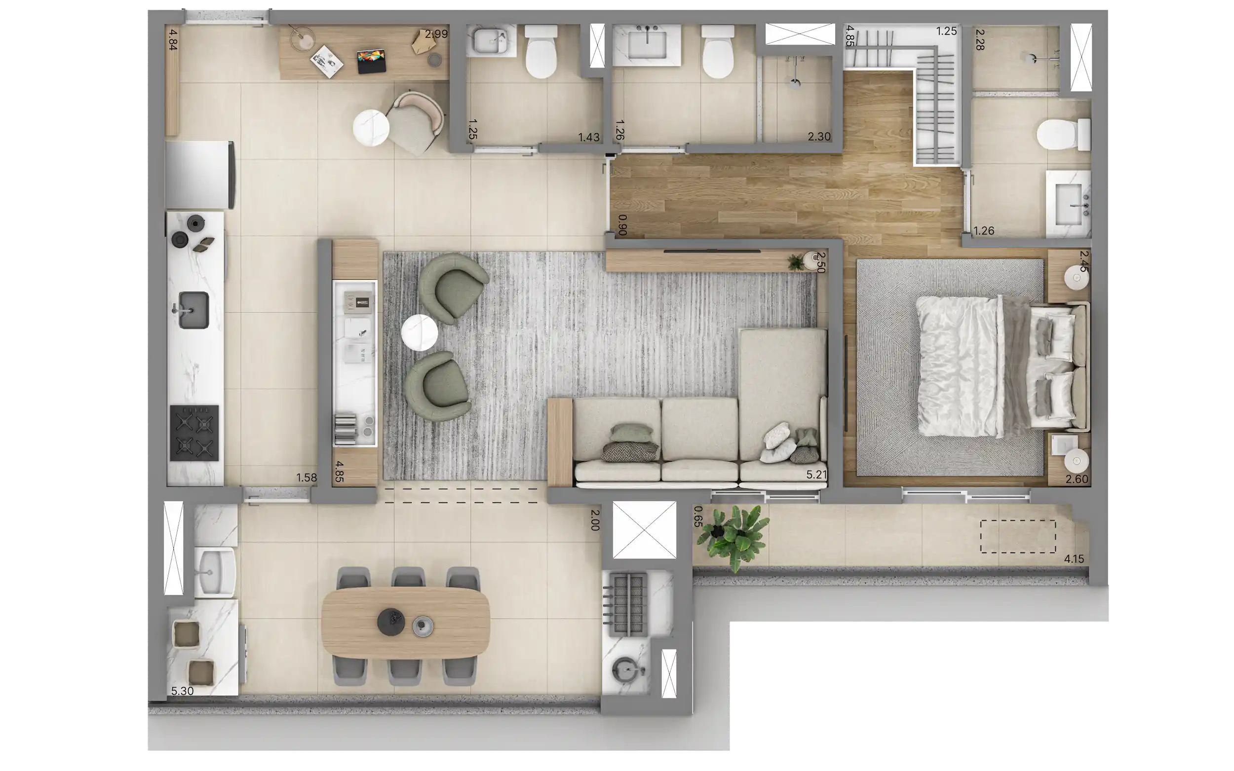 Os apartamentos do LINN Vila Mariana foram desenhados com foco em circulação funcional, boa iluminação natural e integração equilibrada entre os ambientes. As plantas variam de 45 m² a 79 m², com opções de 1, 2 ou 3 dormitórios.