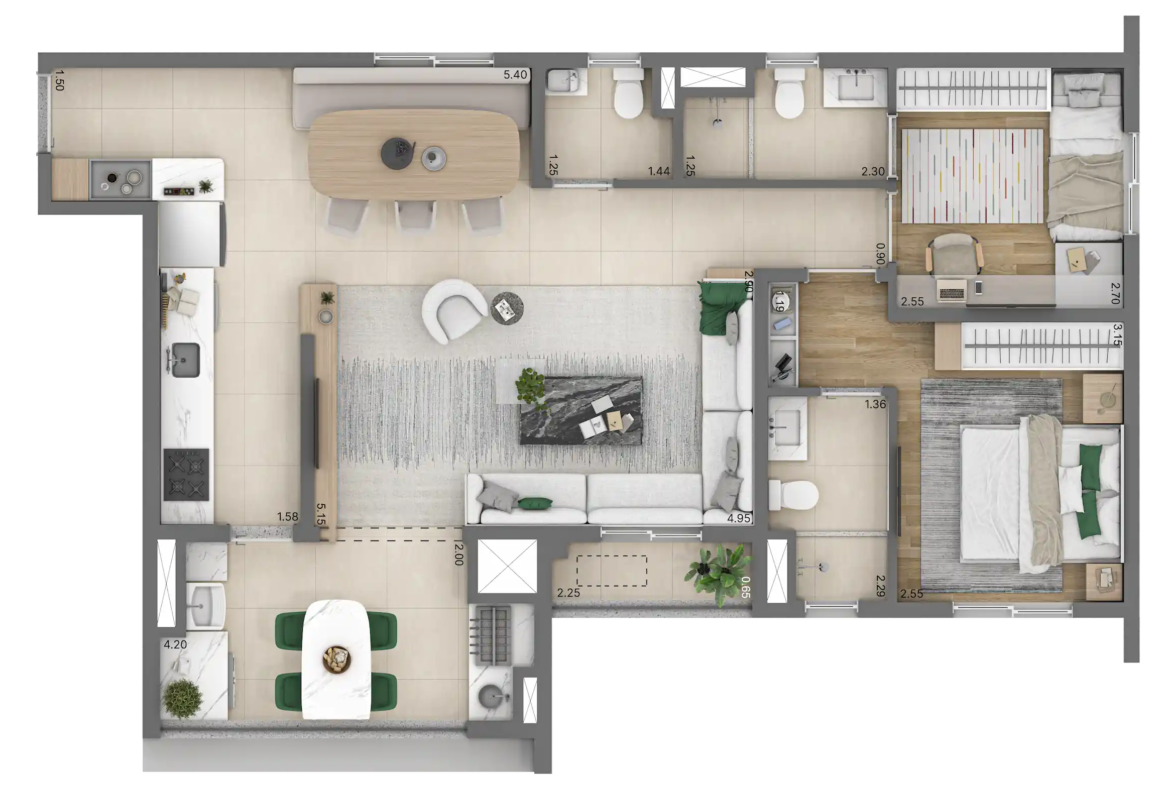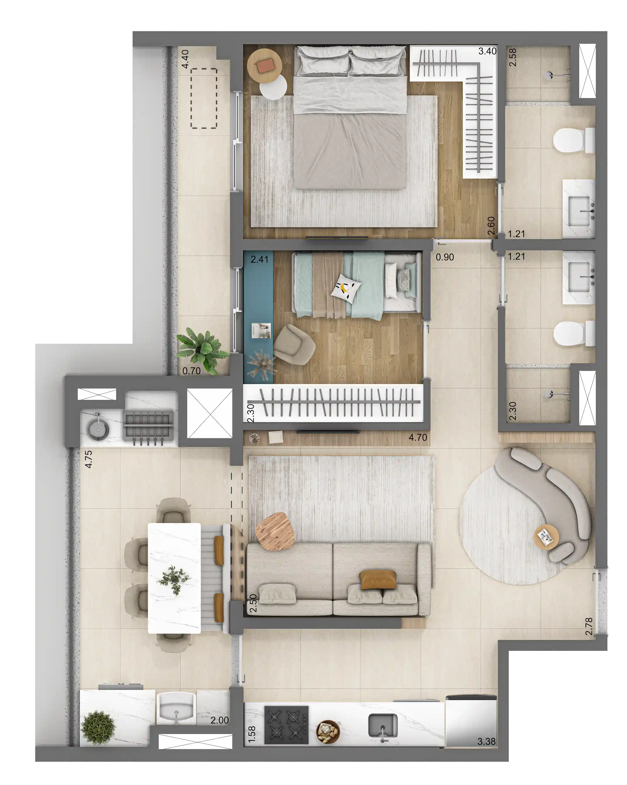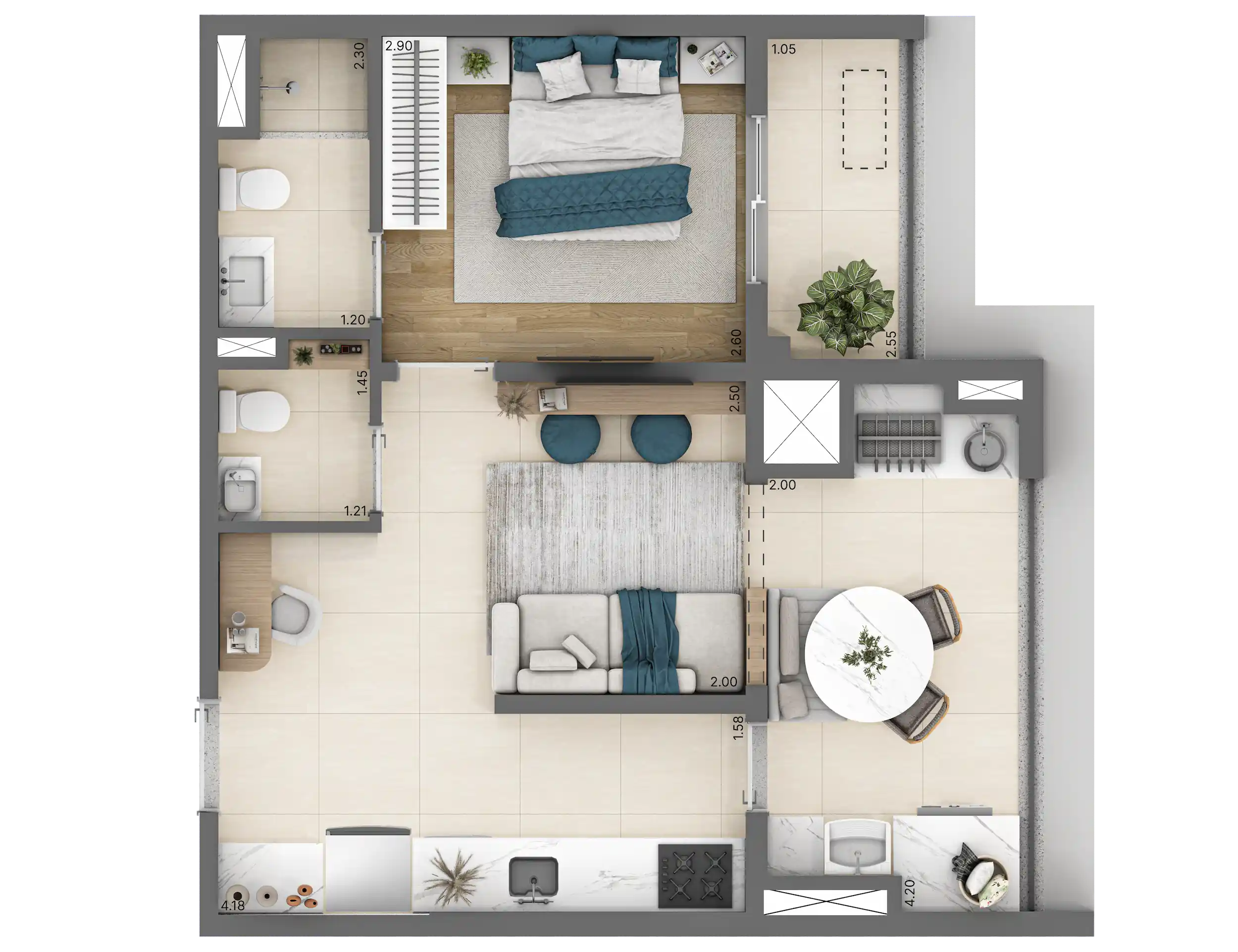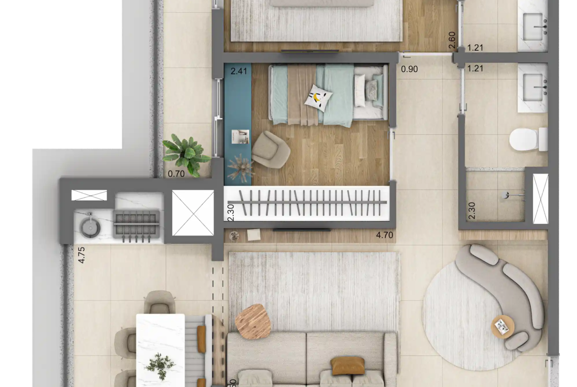 Há configurações com suíte, living ampliado e layouts flexíveis, permitindo melhor separação entre áreas sociais e íntimas e adaptação a diferentes rotinas, desde moradores individuais até núcleos familiares.