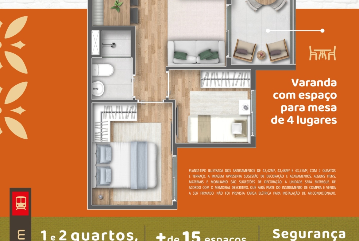 As opções de 1 e 2 dormitórios contemplam configurações com varanda em algumas versões, ampliando a sensação de espaço e iluminação natural das unidades.